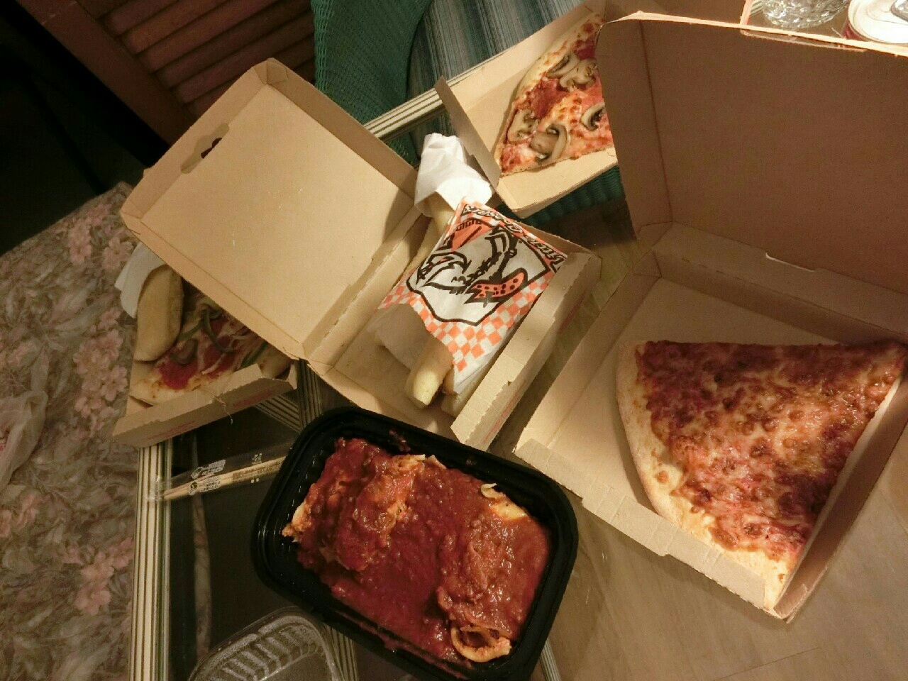 ・なので私たちはピザとラザニアと名前がわからないスティック状のパン生地に中にチーズが入っていてガーリックの粉のようなものが振りかけてあるものを購入しました。