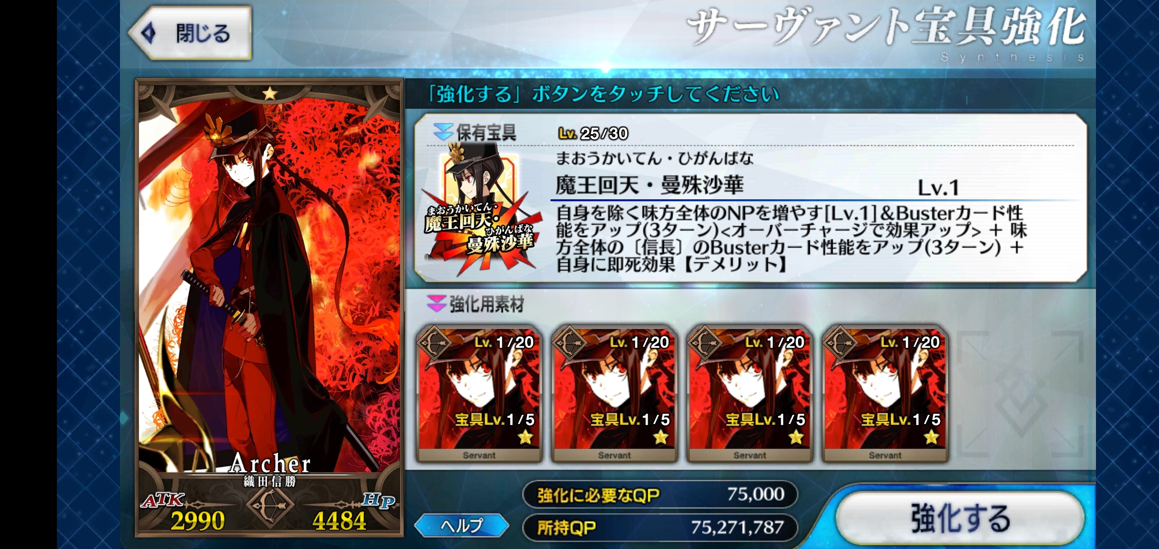 カードは排出率によっては3ターン周回できないこともあるんですが、いまのところ弊カルデアでこれが最適解!オダチェンして後ろにNP配布鯖を据え置いた方が安定するのはわかってるんだけど、マスター礼装レベルを上げたいからこのままでいく。